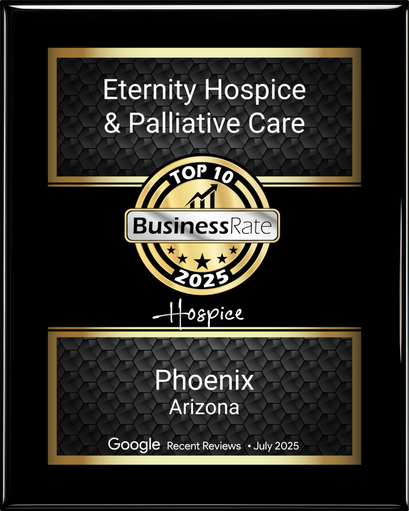 ** Eternity Hospice & Palliative Care has been officially recognized as a TOP 10 of 2025 Phoenix Award Winner in the Hospice Category – an honor based on verified data from Google Reviews, as analyzed and certified by BusinessRate. This recognition is part of the BusinessRate TOP 10 of 2025 Awards which identify local leaders in customer satisfaction, brand reputation, and service excellence using publicly available Google review data.